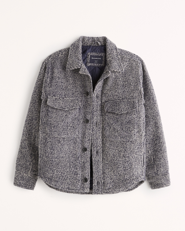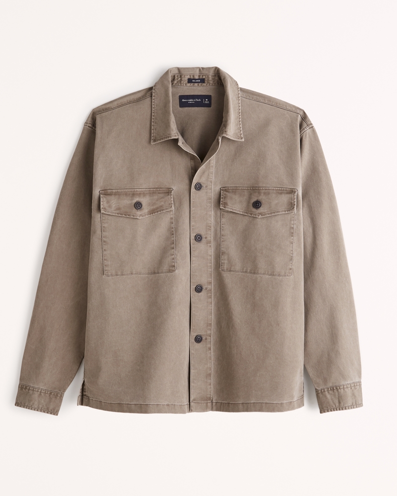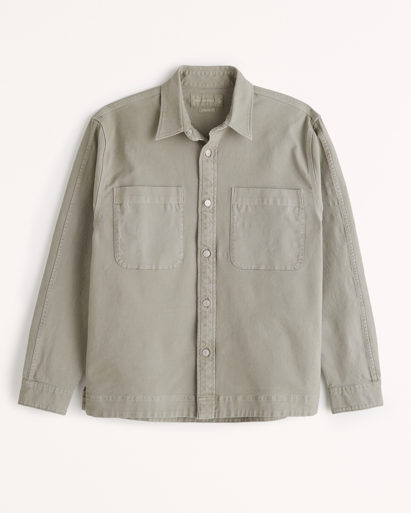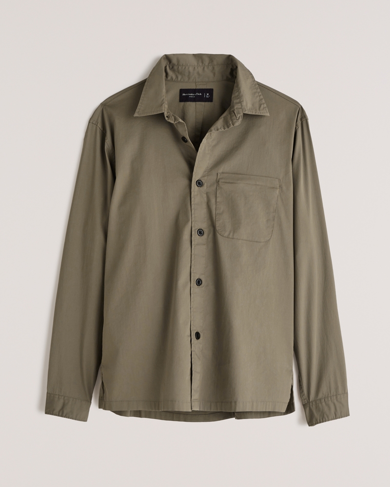All the Abercrombie amped up details. Comfortable shirt jacket in a soft and lightweight twill fabric with a left chest pocket button-down front and curved hem.